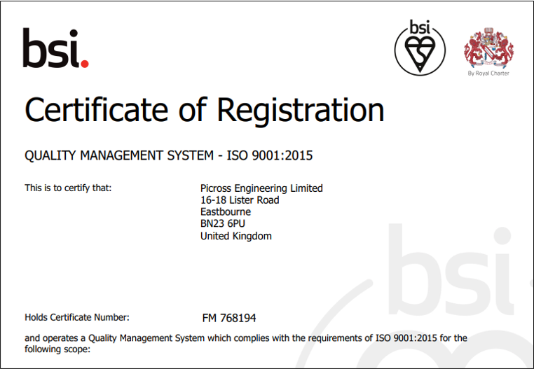 In fact the company reputation has been built on it, enabling the use of the coveted BSI certification. This is currently to ISO 9001 Quality Management certified by BSI under certificate number FM 02242.